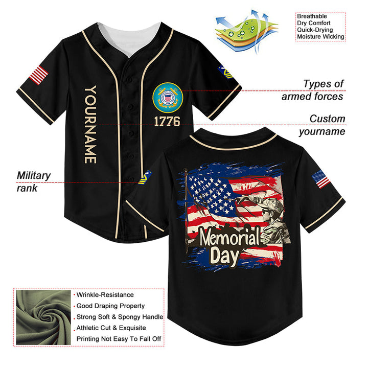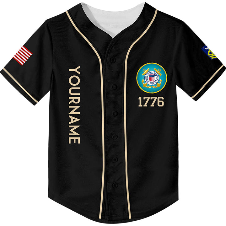 Custom Black 1776 American Flag U.S Coast Guard Military Rank Name Memorial Day Baseball Jersey