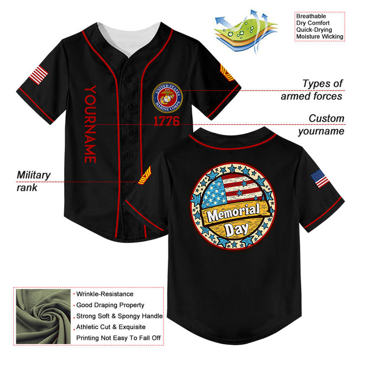 Custom Black 1776 American Flag U.S Marine Corps Military Rank Name Memorial Day Baseball Jersey