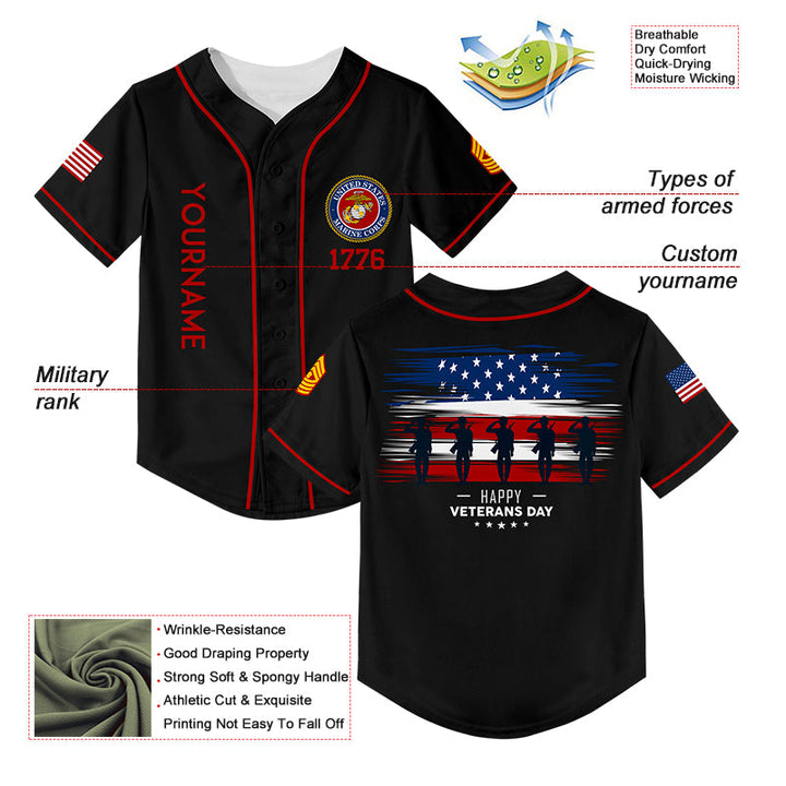 Custom Black 1776 Flag U.S Marine Corps Military Rank Name Veterans Day Baseball Jersey | Father's Day Gifts