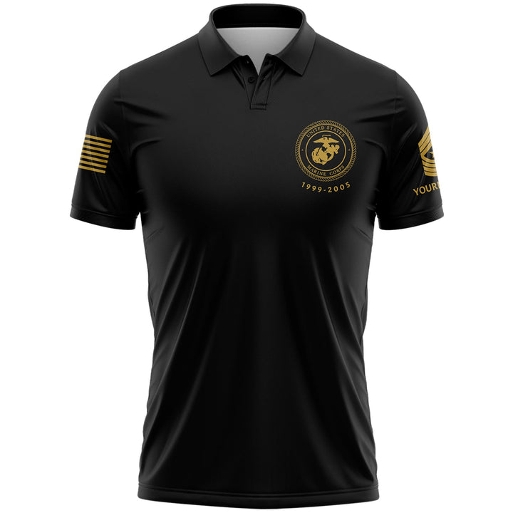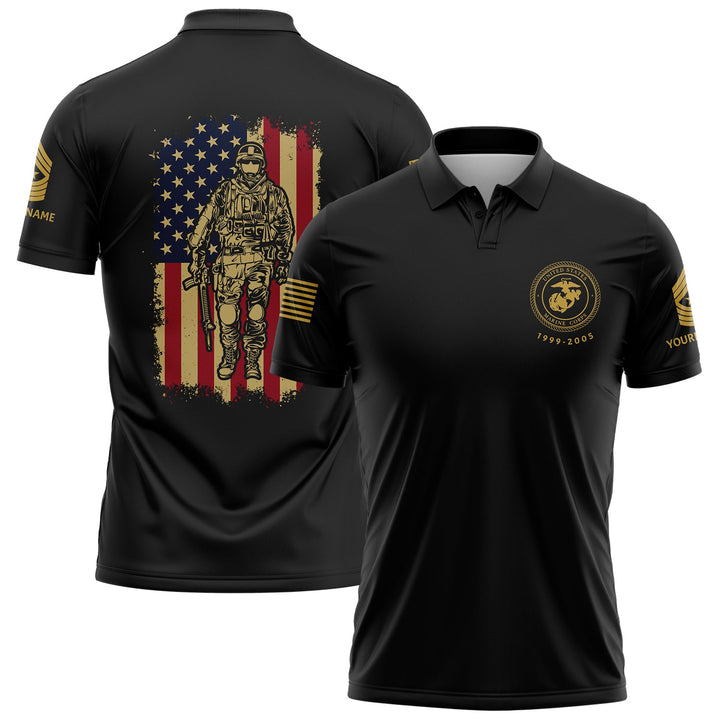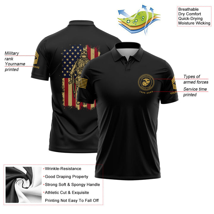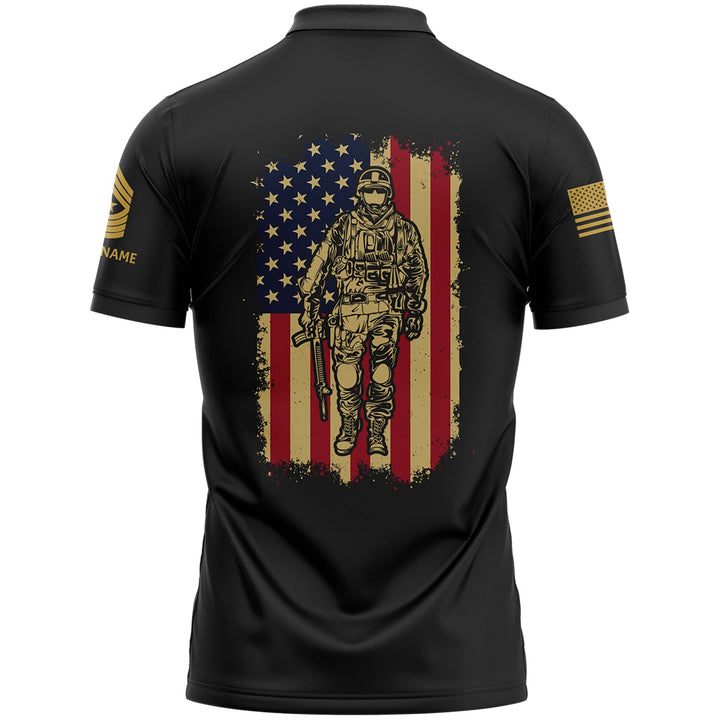 Custom Black American Flag Military Rank Veteran Name Golf Polo Shirt