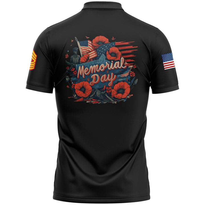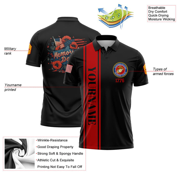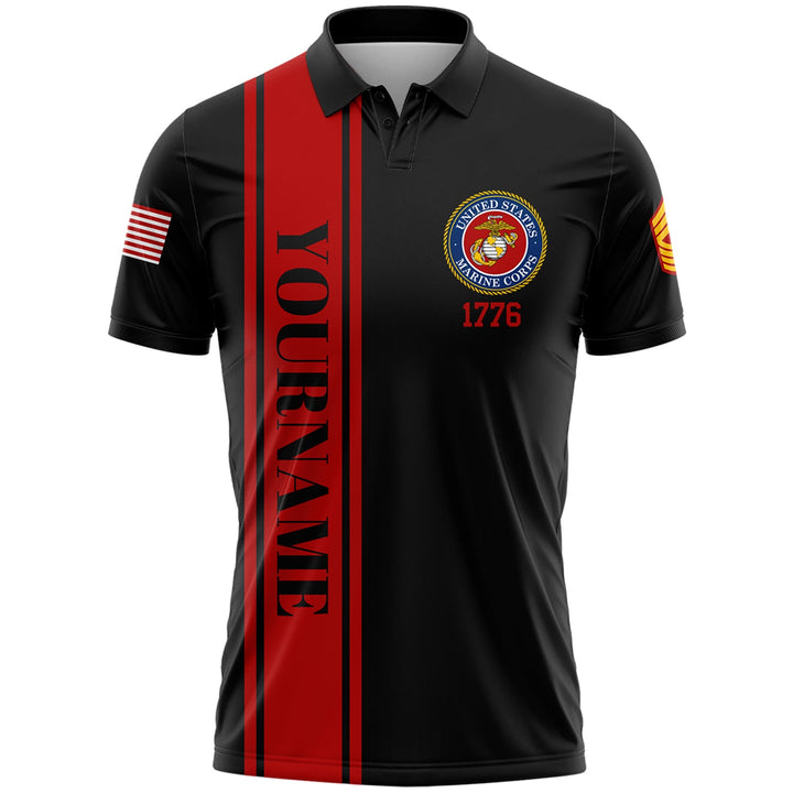 Custom Black Flower 1776 American Flag U.S Marine Corps Military Rank Name Memorial Day Golf Polo Shirt