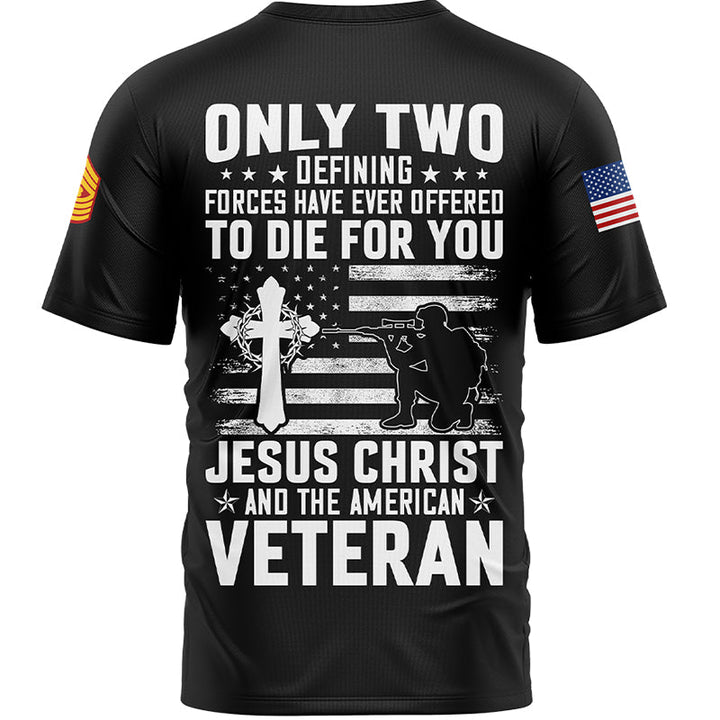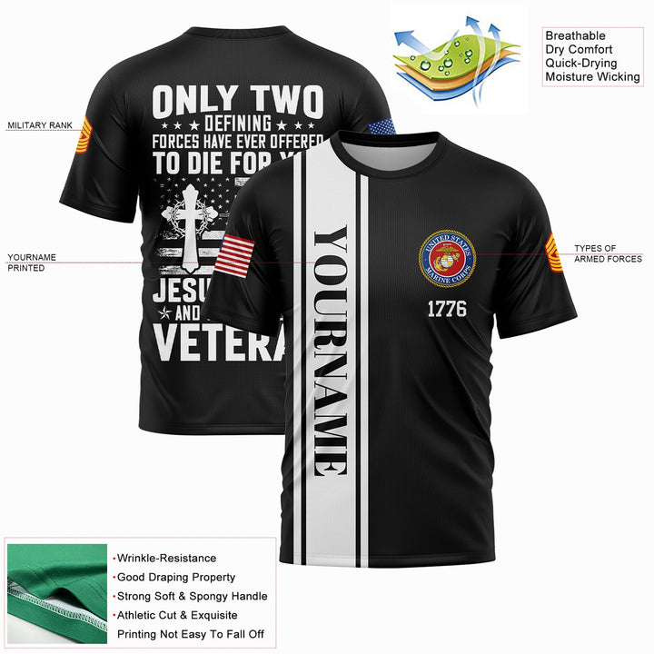 Custom Black Only Two Defining Forces Have Ever Deffered Jesus Christ And The American Veteran 1776 Flag U.S Marine Corps Military Rank Name Veterans Day T-Shirt | Father's Day Gifts