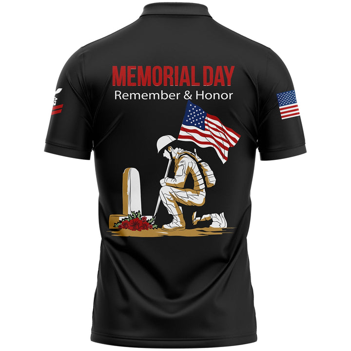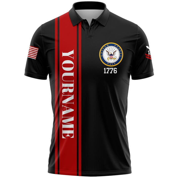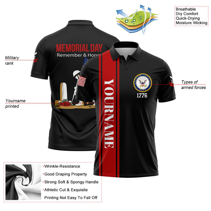 Custom Black Remember Honor 1776 American Flag U.S Navy Military Rank Name Memorial Day Golf Polo Shirt