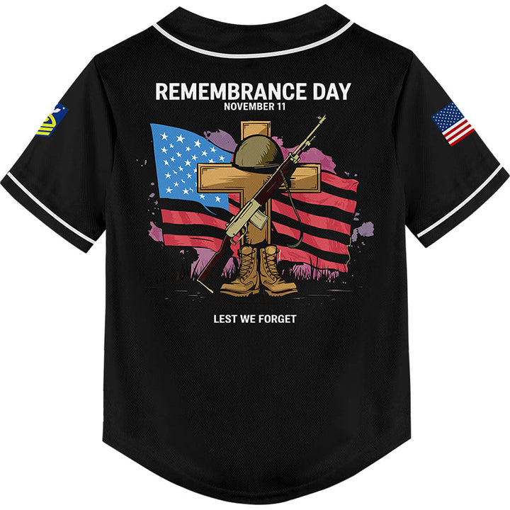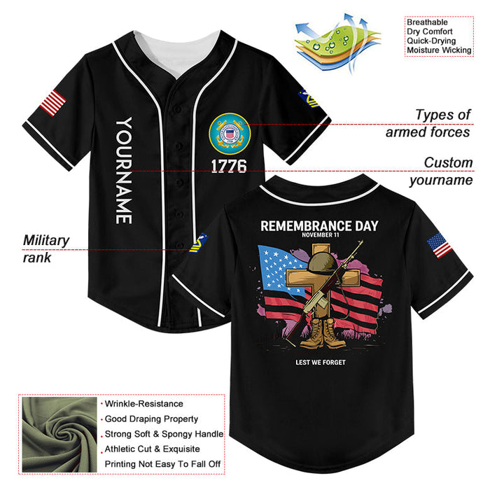 Custom Black Remembrance Day November 11 Lest We Forget 1776 American Flag U.S Coast Guard Military Rank Name Memorial Day Baseball Jersey