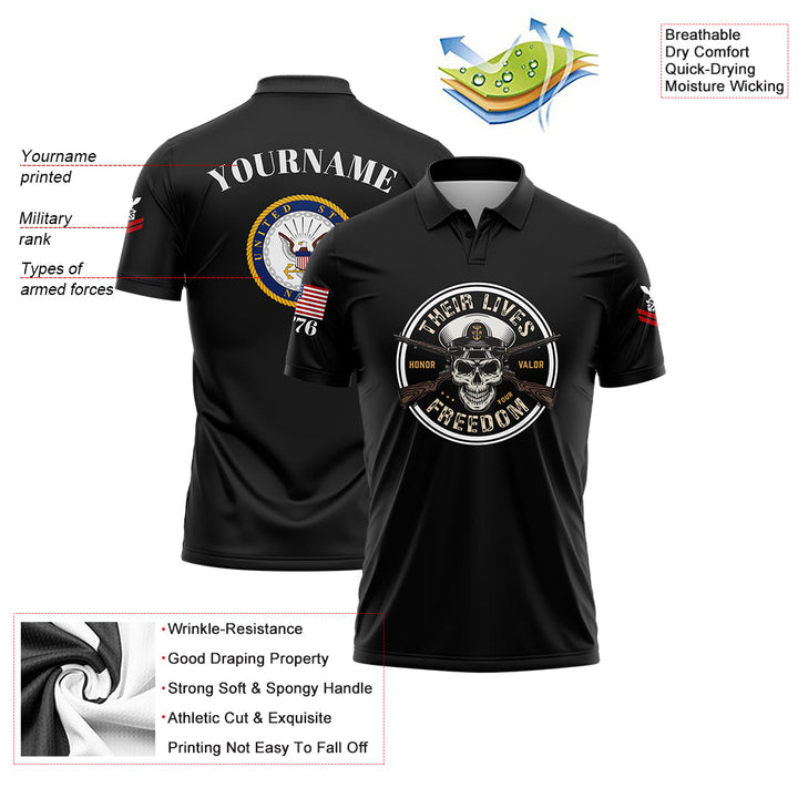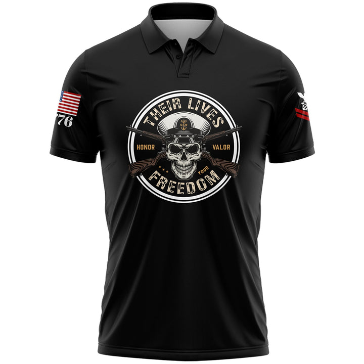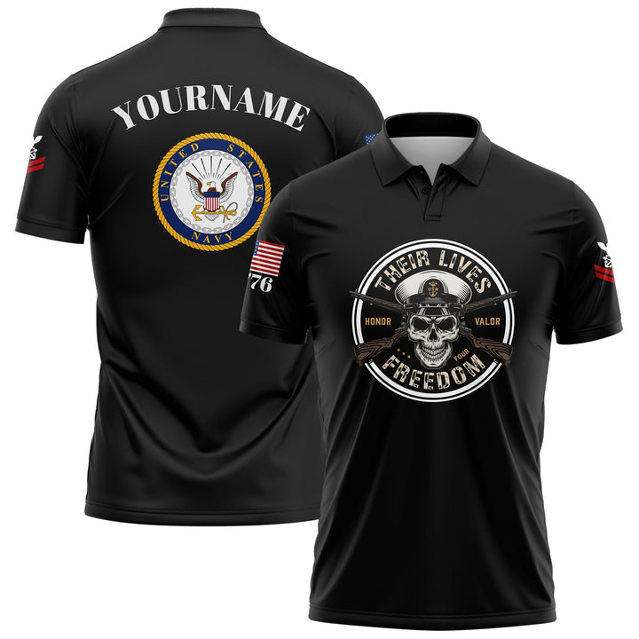 Custom Black Skull Their Lives Freedom 1776 U.S Navy Military Rank Name Golf Polo Shirt
