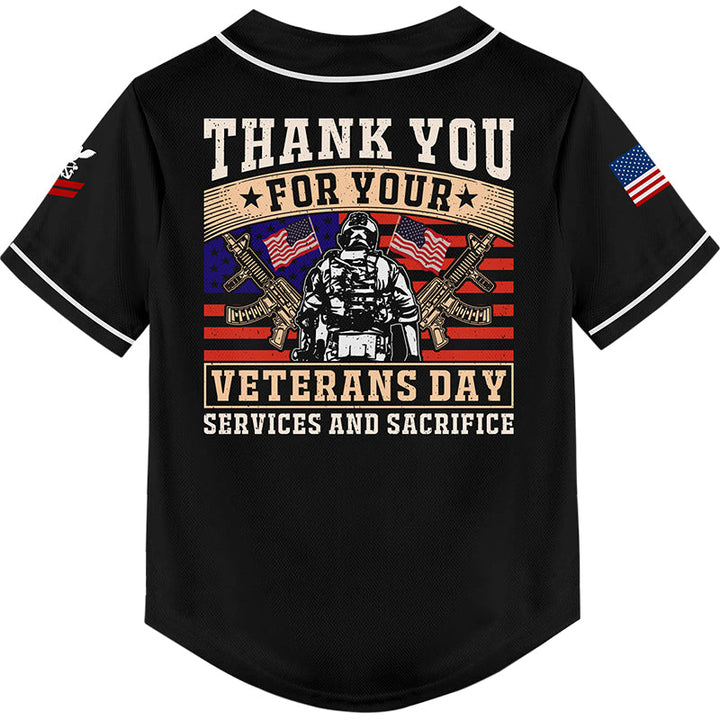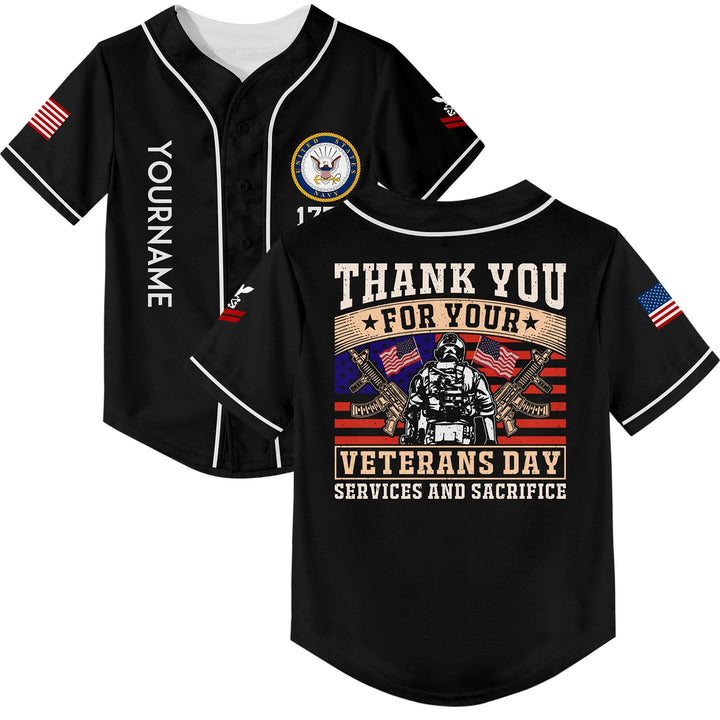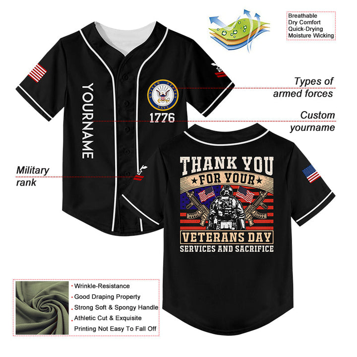 Custom Black Thank You For Your Services And Sacrifice 1776 American Flag U.S Navy Military Rank Name Veterans Day Baseball Jersey