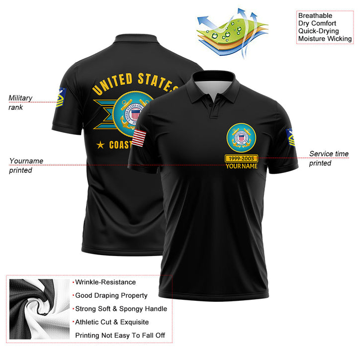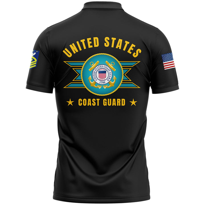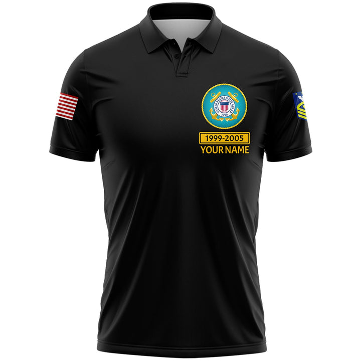 Custom Black U.S Coast Guard Military Rank Veteran Name Golf Polo Shirt