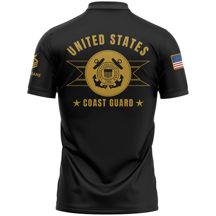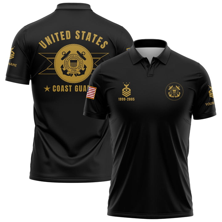Custom Black U.S Coast Guard Military Rank Veteran Name Golf Polo Shirt