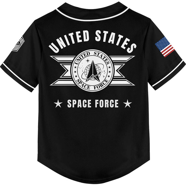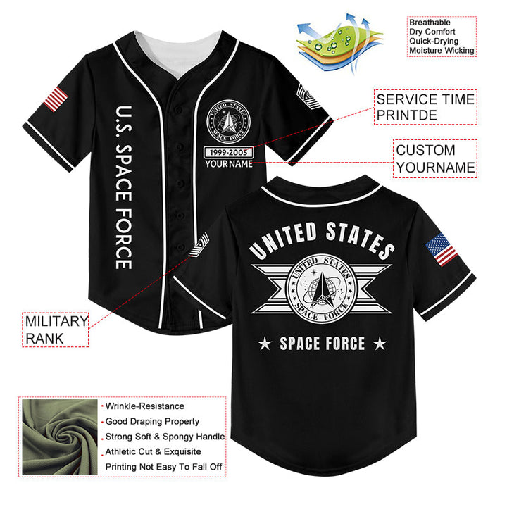 Custom Black U.S Space Force Military Rank Veteran Name Baseball Jersey