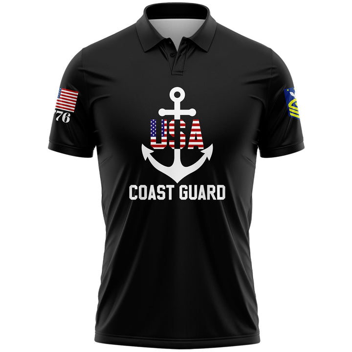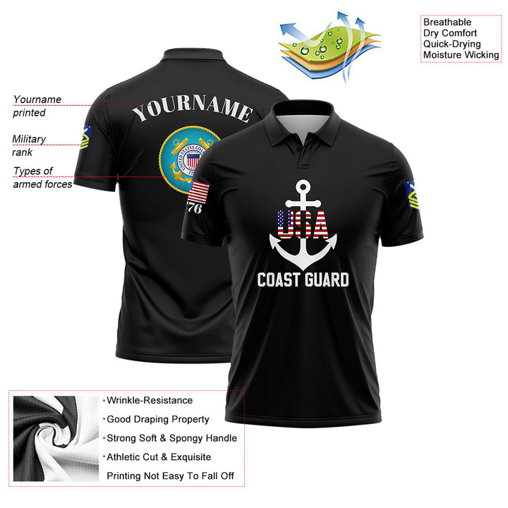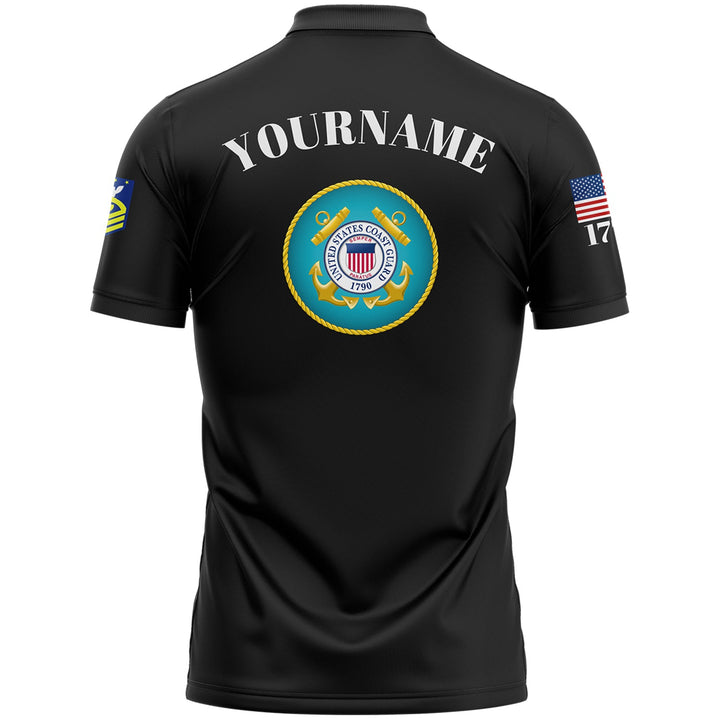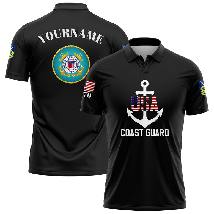 Custom Black USA 1776 American Flag U.S Coast Guard Military Rank Name Memorial Day Golf Polo Shirt