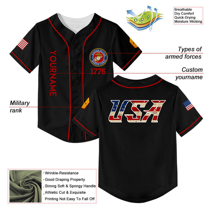 Custom Black USA 1776 American Flag U.S Marine Corps Military Rank Name Baseball Jersey