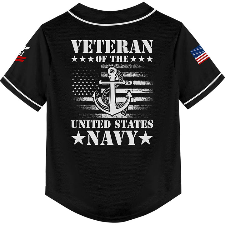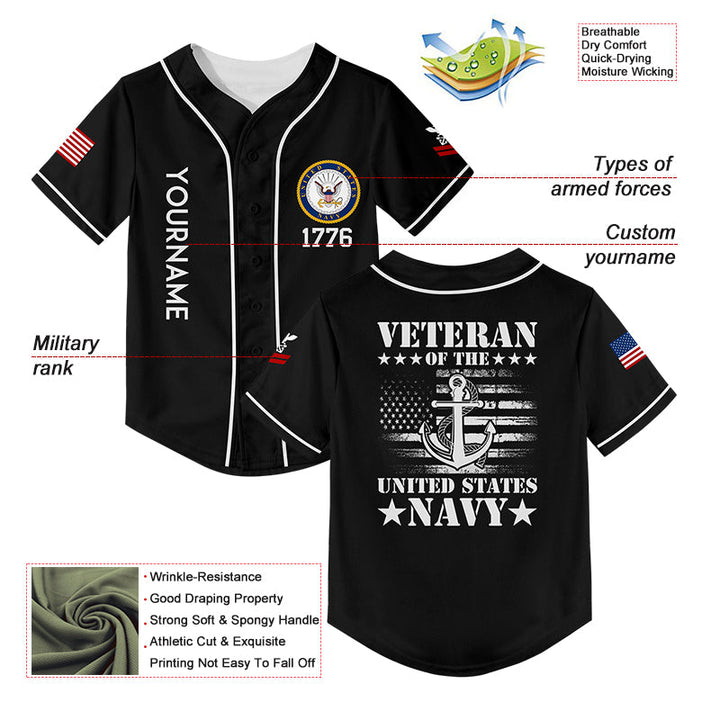 Custom Black Veteran 1776 American Flag U.S Navy Military Rank Name Baseball Jersey