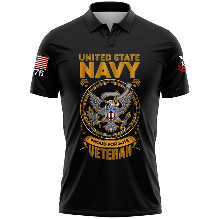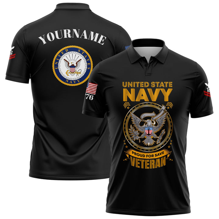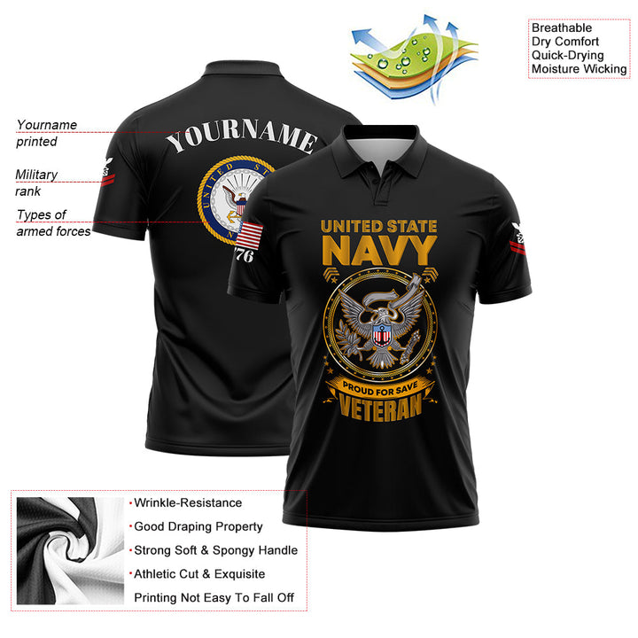 Custom Black Veterans 1776 American Flag U.S Navy Military Rank Name Golf Polo Shirt