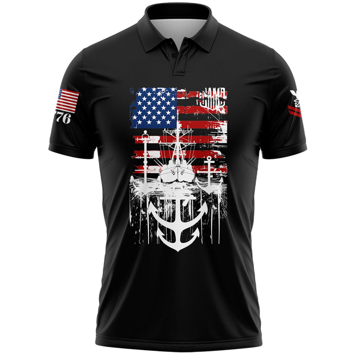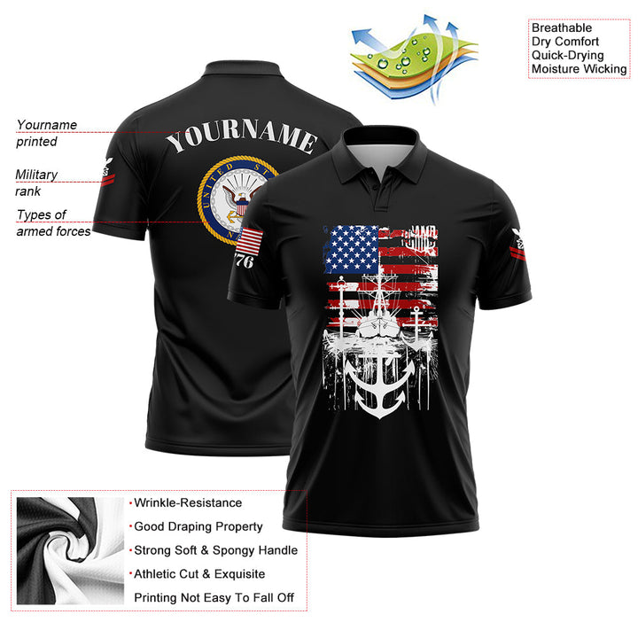 Custom Black Warship 1776 American Flag U.S Navy Military Rank Name Golf Polo Shirt