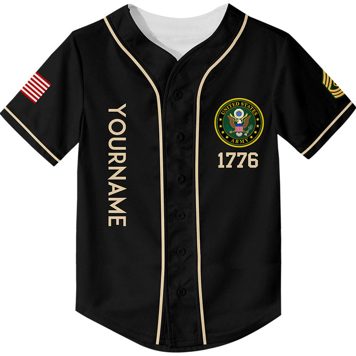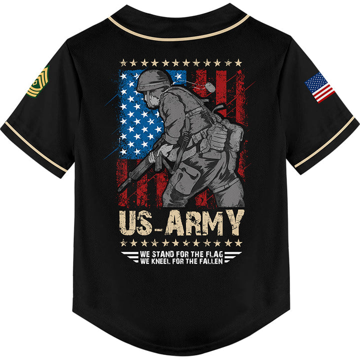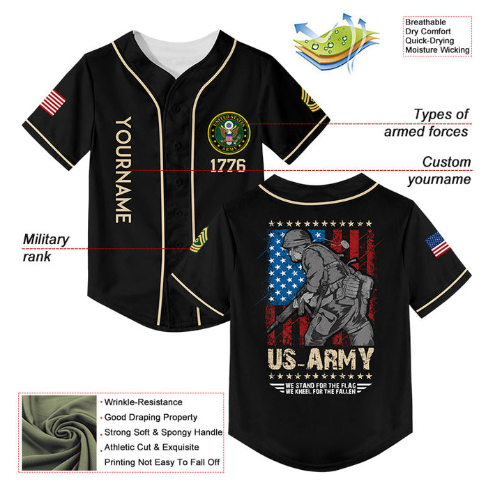 Custom Black We Stand For The Flag We Kneel For The Fallen 1776 American Flag U.S Army Military Rank Name Baseball Jersey