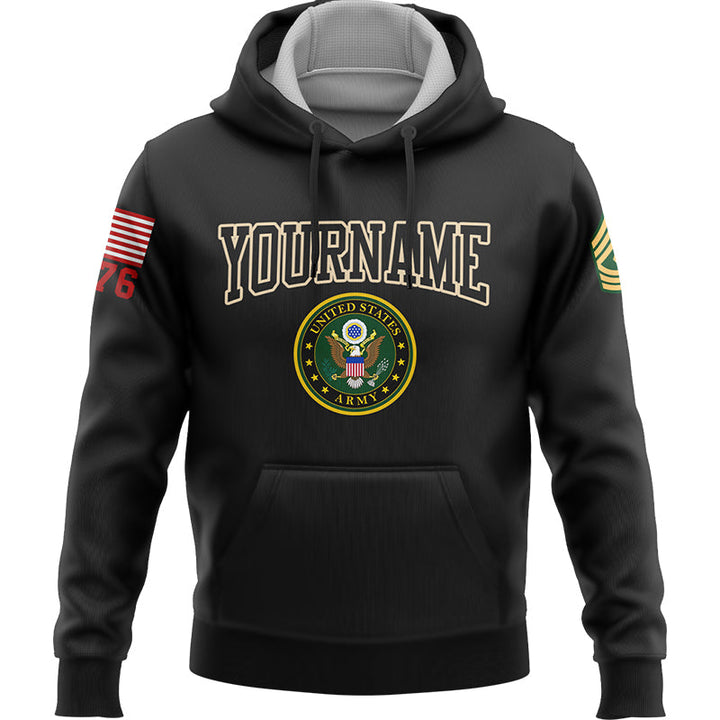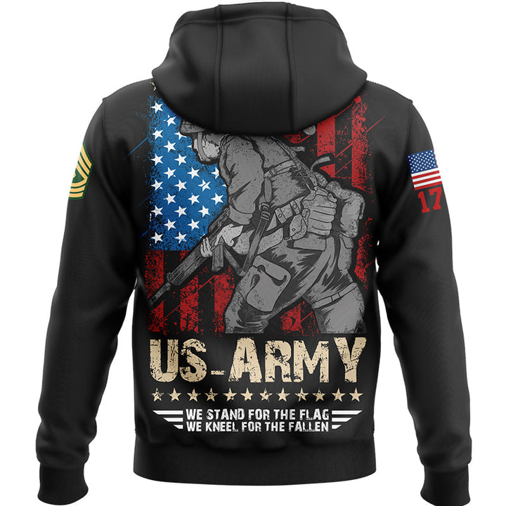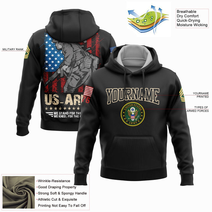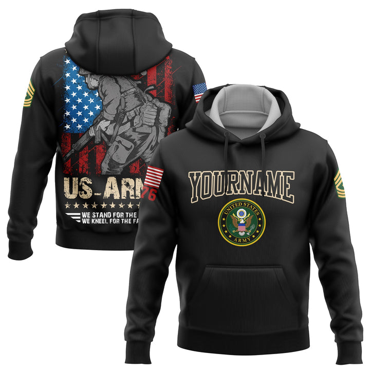 Custom Black We Stand For The Flag We Kneel For The Fallen 1776 American Flag U.S Army Military Rank Name Hoodie