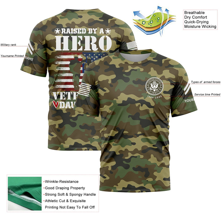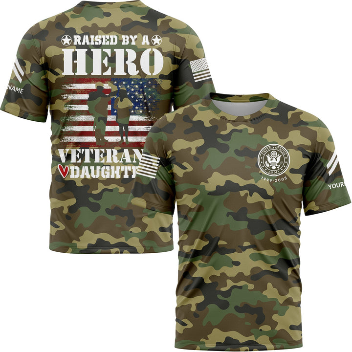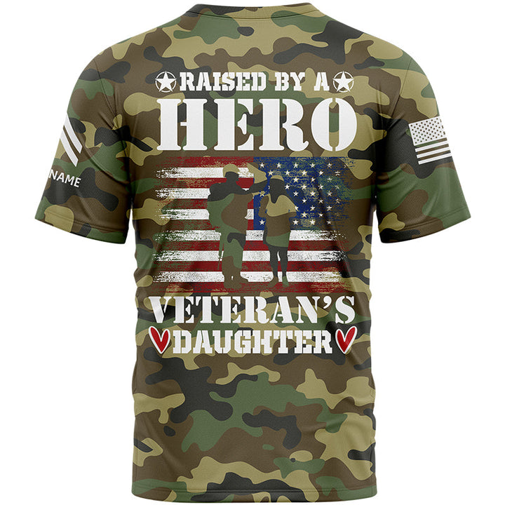 Custom Camo Raised By A Hero Veteran's Daughter 1776 Flag U.S Army Military Rank Corporal Name Veterans Day T-Shirt | Father's Day Gifts