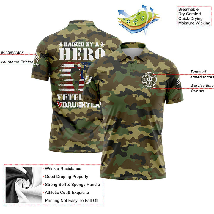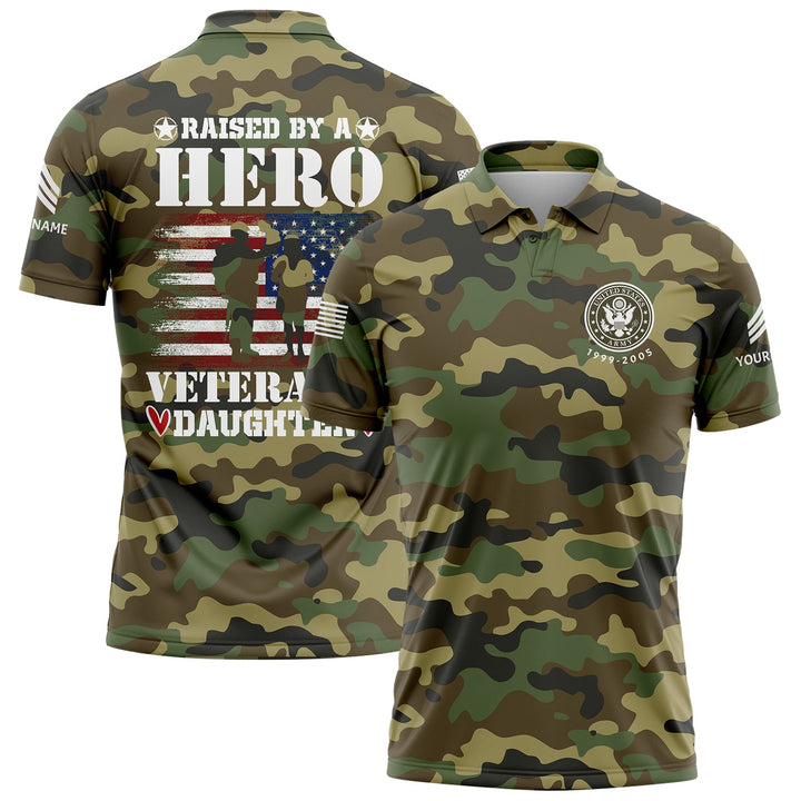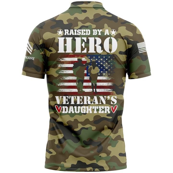 Custom Camo Raised By A Hero Veteran's Daughter Flag U.S. Army Military Sergeant Rank Name Veterans Day Golf Polo Shirt | Father's Day Gifts