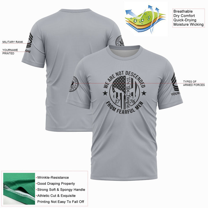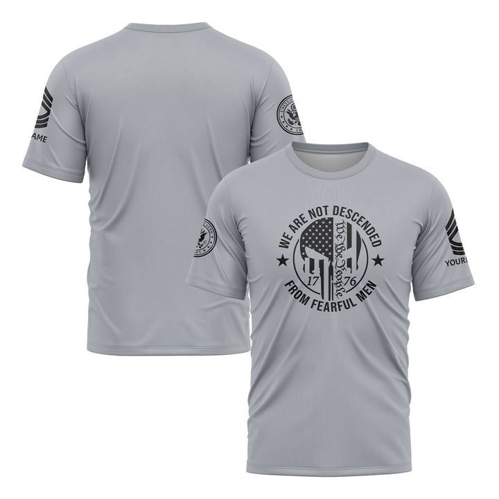 Custom Grey 1776 We Are Not Descended From Fearful Men Military Rank Veteran Name T-Shirt