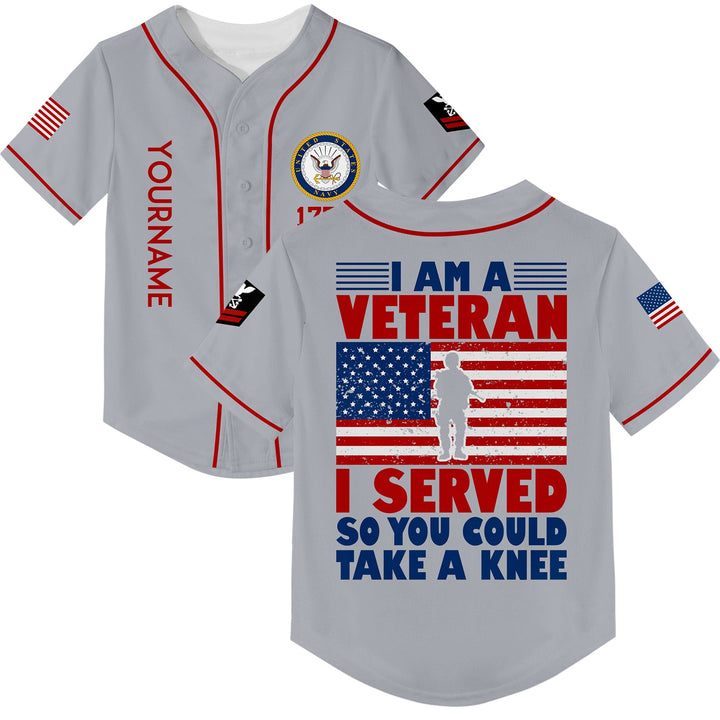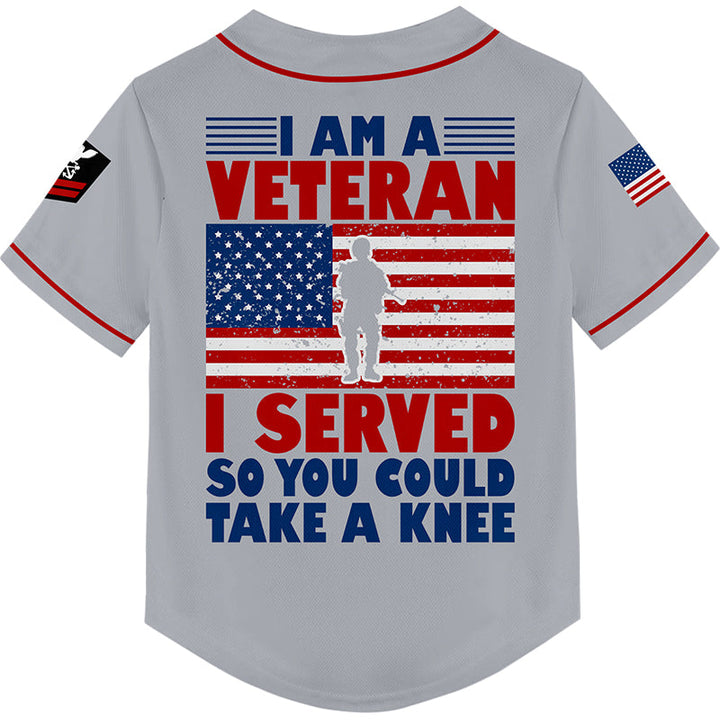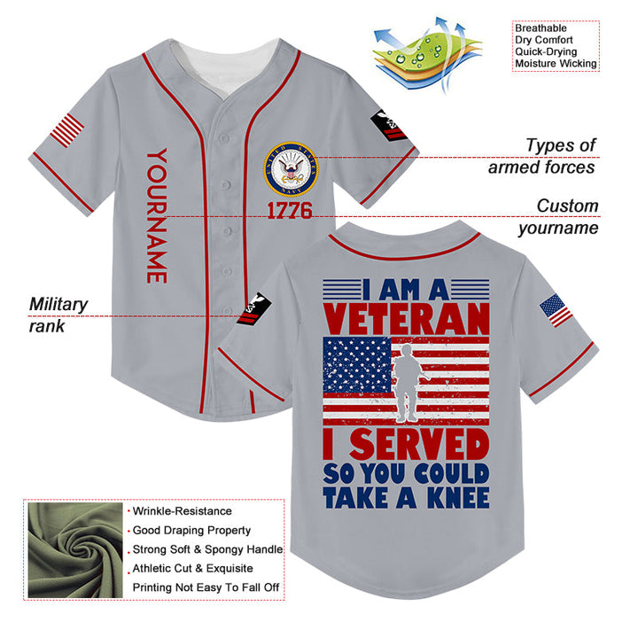 Custom Grey I'M A Veteran I Served So You Could Take A Knee 1776 Flag Military Rank Name Veterans Day Baseball Jersey