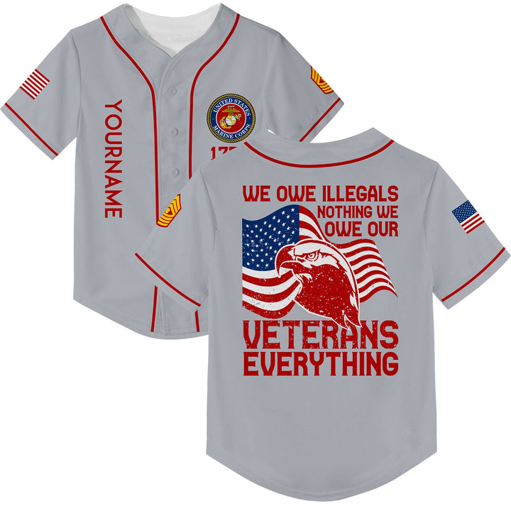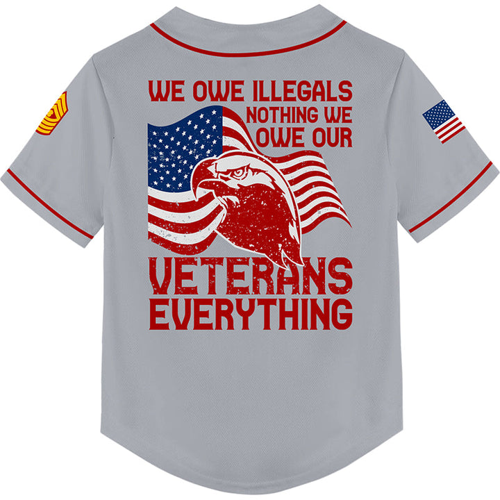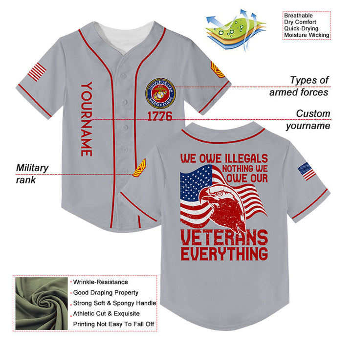 Custom Grey We Own Illegals Nothing We Our Veterans Everything 1776 Eagle Flag Military Rank Name Veterans Day Baseball Jersey