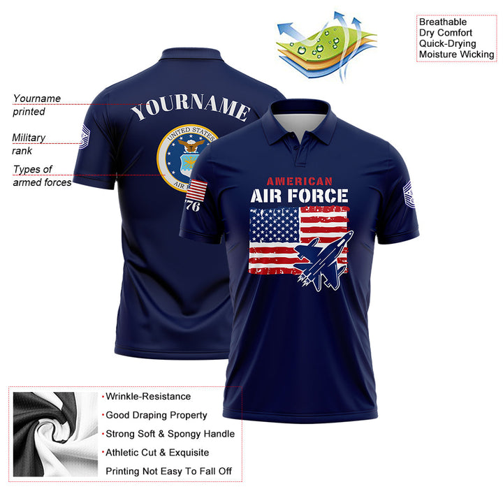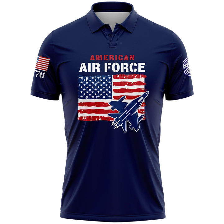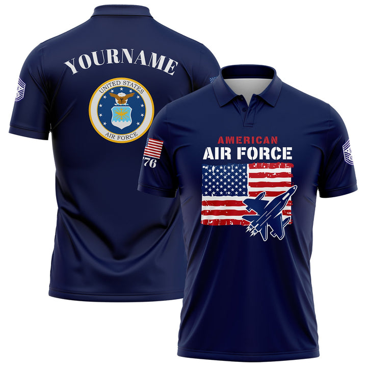 Custom Navy 1776 American Flag U.S Air Force Military Rank Name Golf Polo Shirt