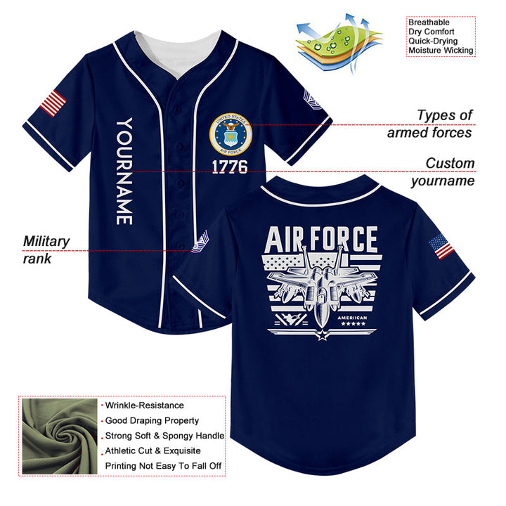 Custom Navy Fighter 1776 American Flag U.S Air Force Military Rank Name Baseball Jersey