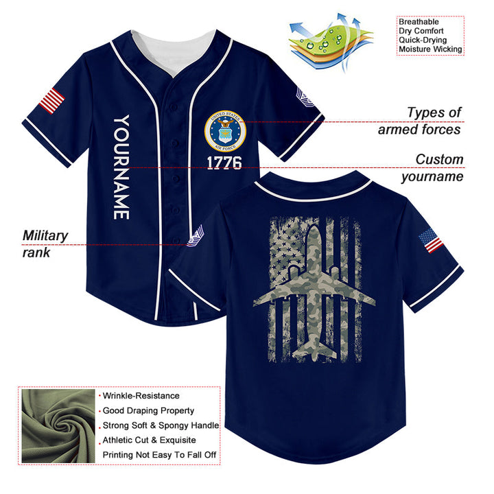 Custom Navy Fighter 1776 American Flag U.S Air Force Military Rank Name Baseball Jersey