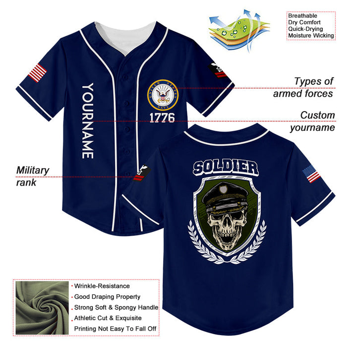 Custom Navy Skull Soldier 1776 U.S Navy Military Rank Name Baseball Jersey