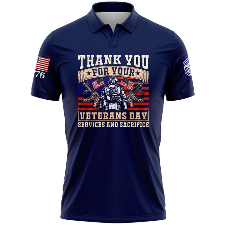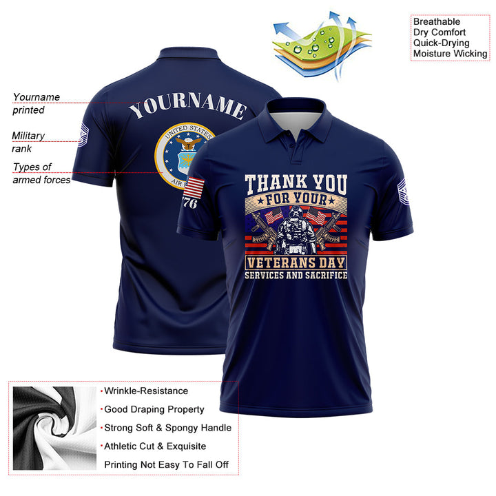 Custom Navy Thank You For Your Services And Sacrifice 1776 American Flag U.S Air Force Military Rank Name Veterans Day Golf Polo Shirt