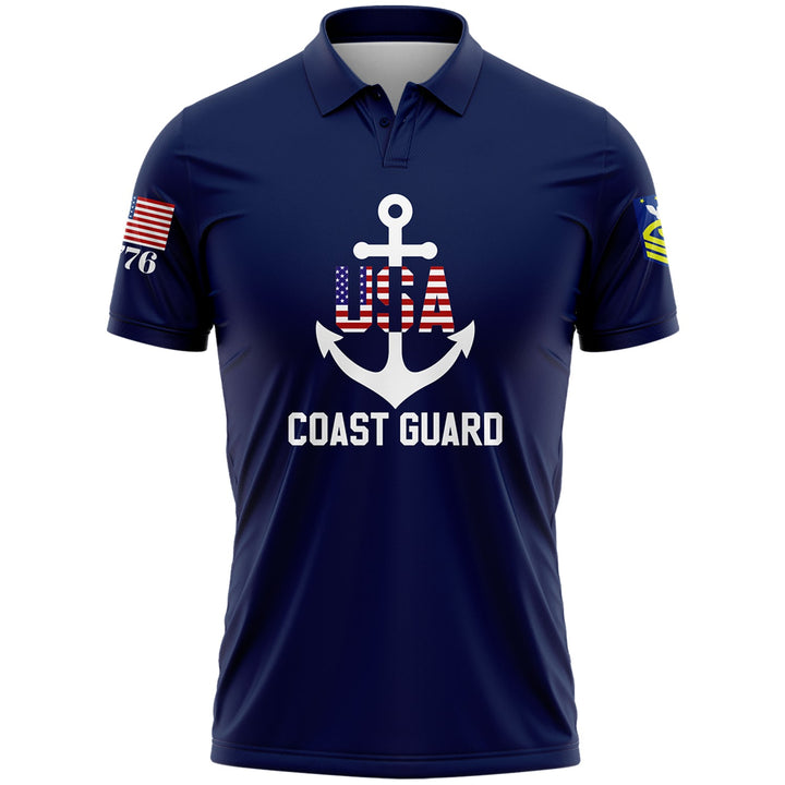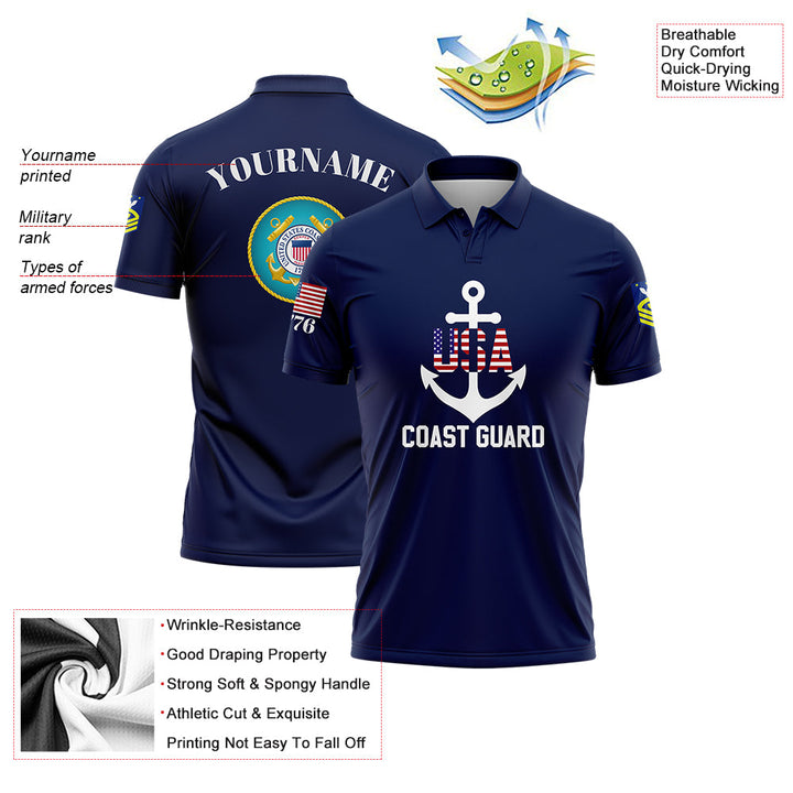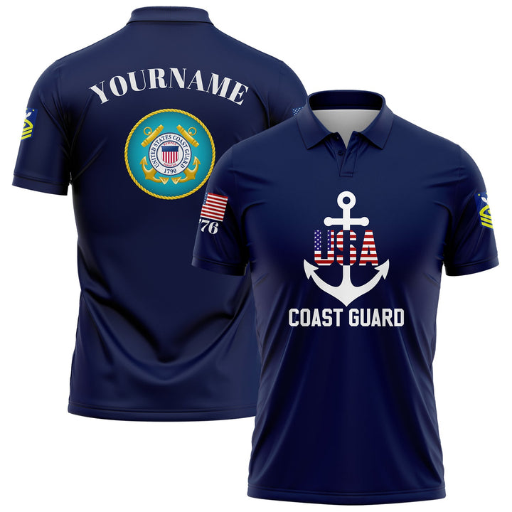 Custom Navy USA 1776 American Flag U.S Coast Guard Military Rank Name Memorial Day Golf Polo Shirt