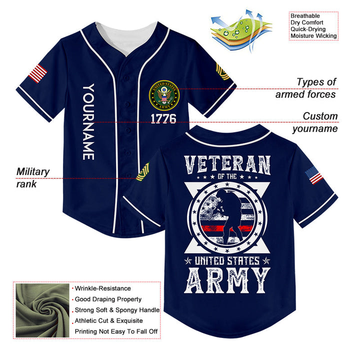 Custom Navy Veteran 1776 American Flag U.S Army Military Rank Name Baseball Jersey