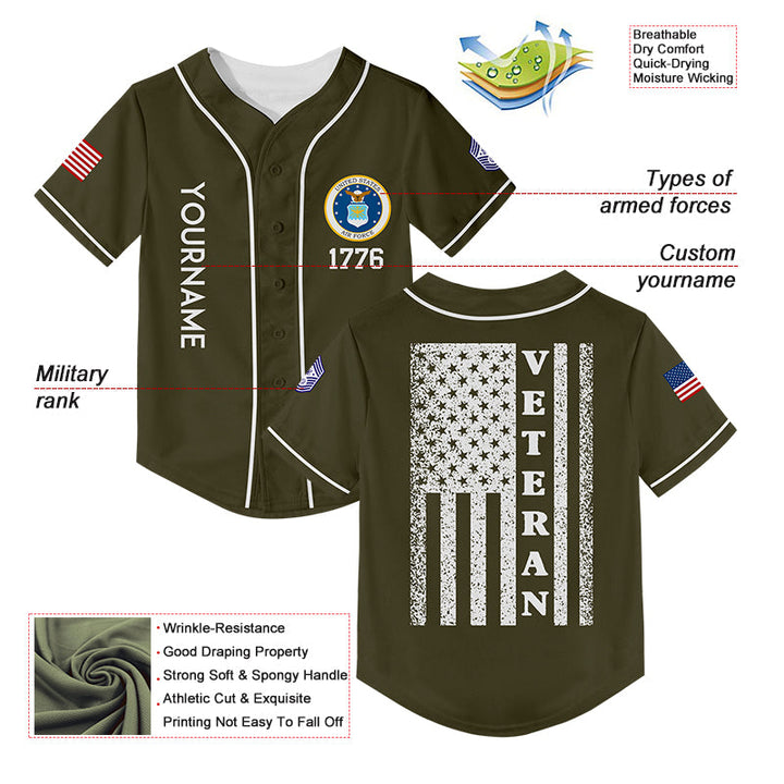 Custom Olive 1776 American Flag Military Rank Name Veterans Day Baseball Jersey