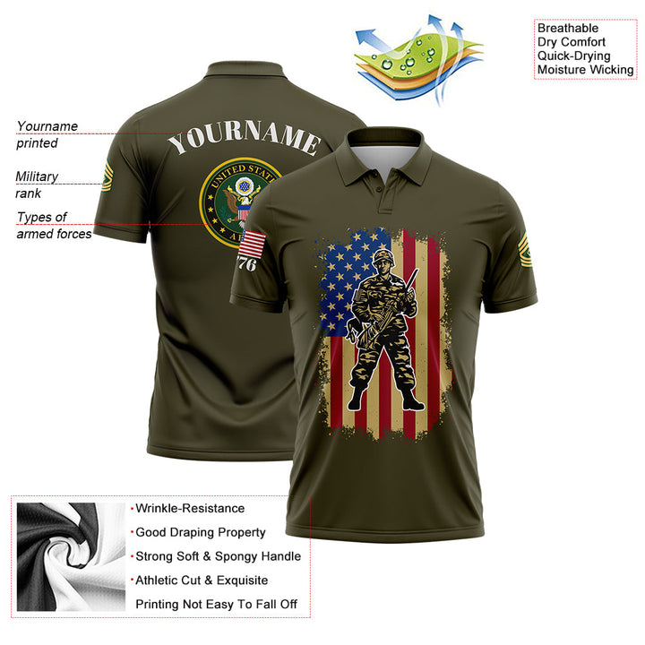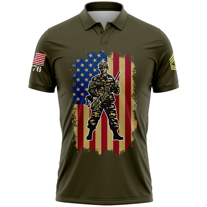 Custom Olive 1776 American Flag U.S Army Military Rank Name Golf Polo Shirt