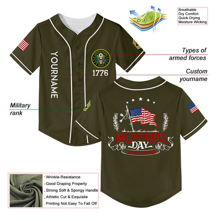 Custom Olive 1776 American Flag U.S Army Military Rank Name Memorial Day Baseball Jersey