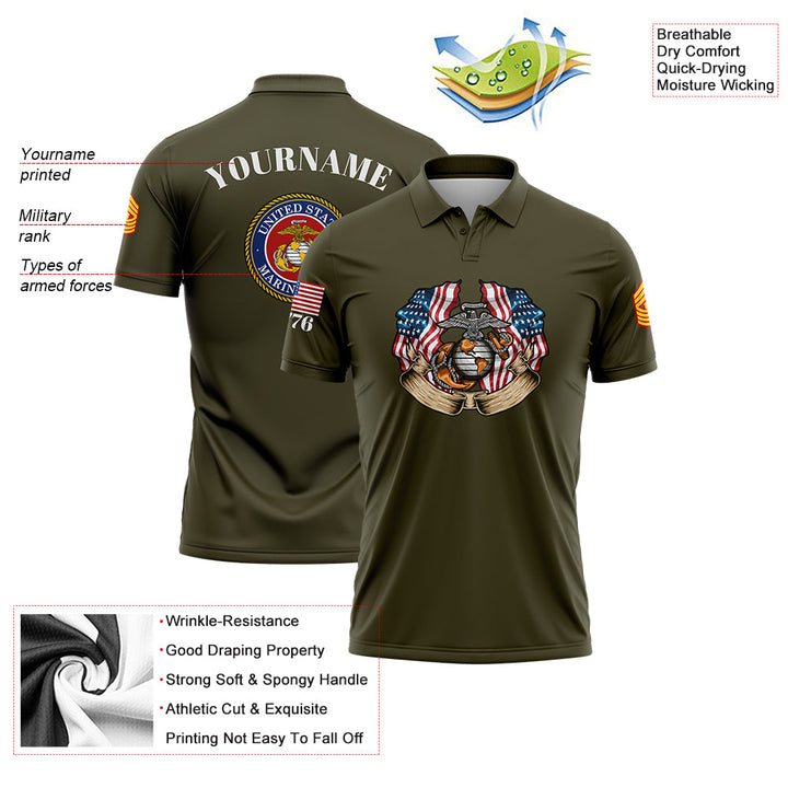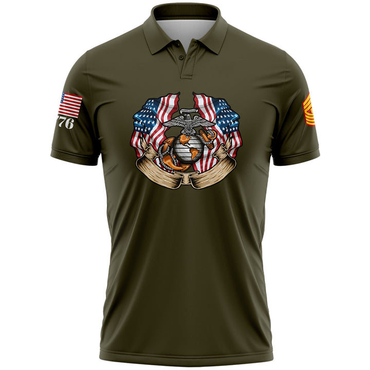 Custom Olive 1776 American Flag U.S Marine Corps Military Rank Name Golf Polo Shirt