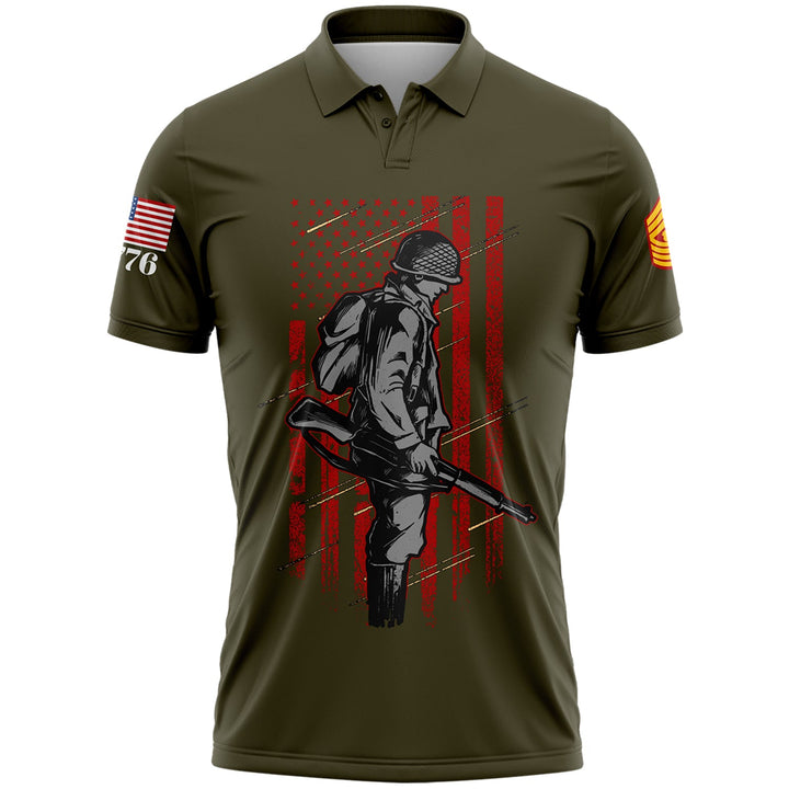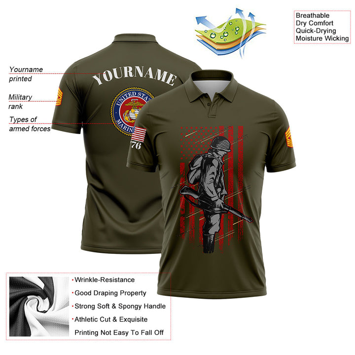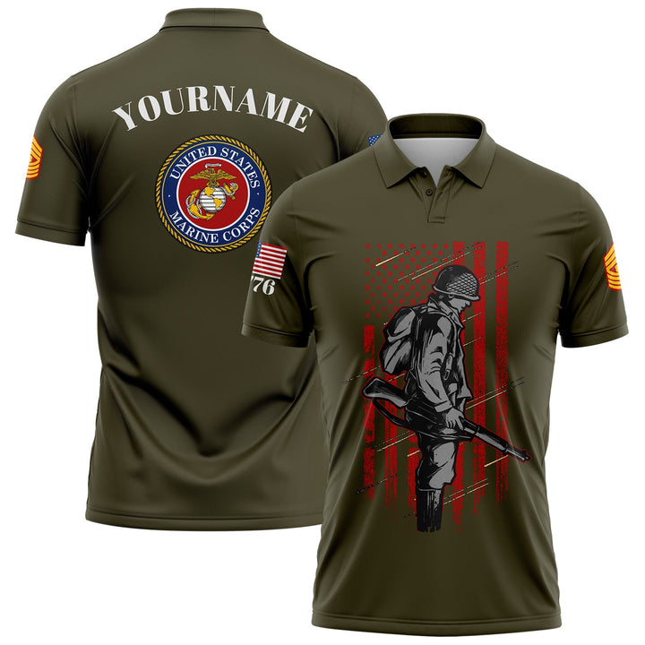 Custom Olive 1776 American Flag U.S Marine Corps Military Rank Name Golf Polo Shirt