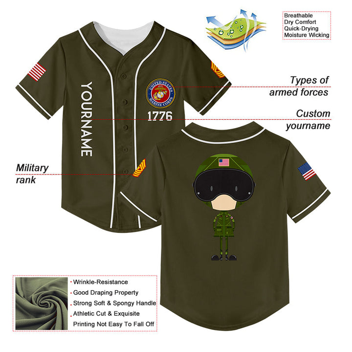 Custom Olive Cartoon 1776 U.S Marine Corps Military Rank Name Baseball Jersey