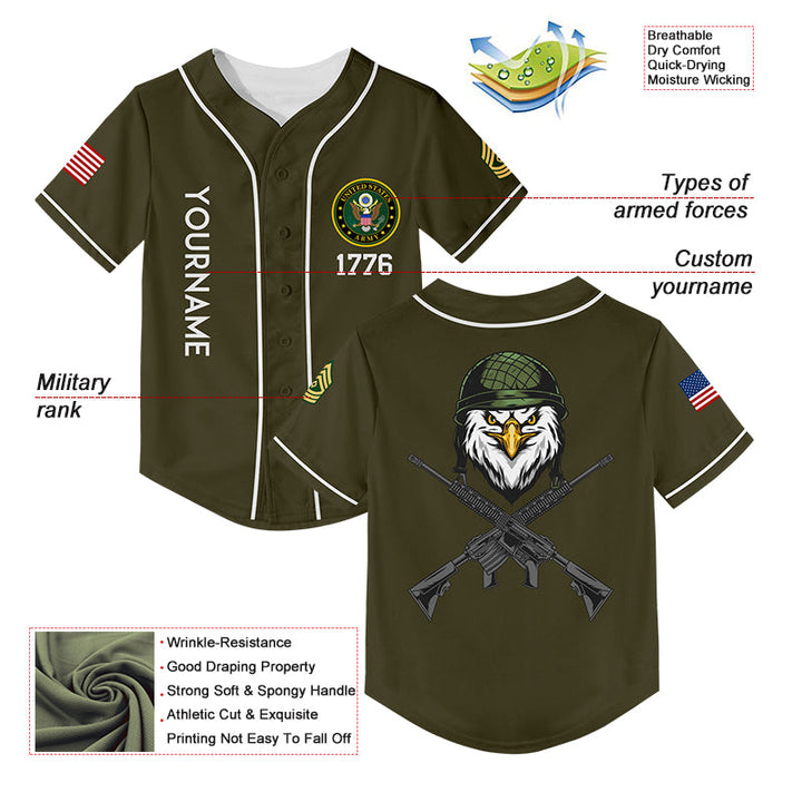 Custom Olive Eagle 1776 U.S Army Military Rank Name Baseball Jersey