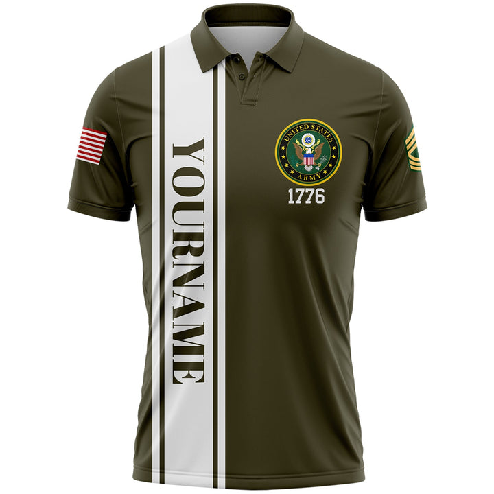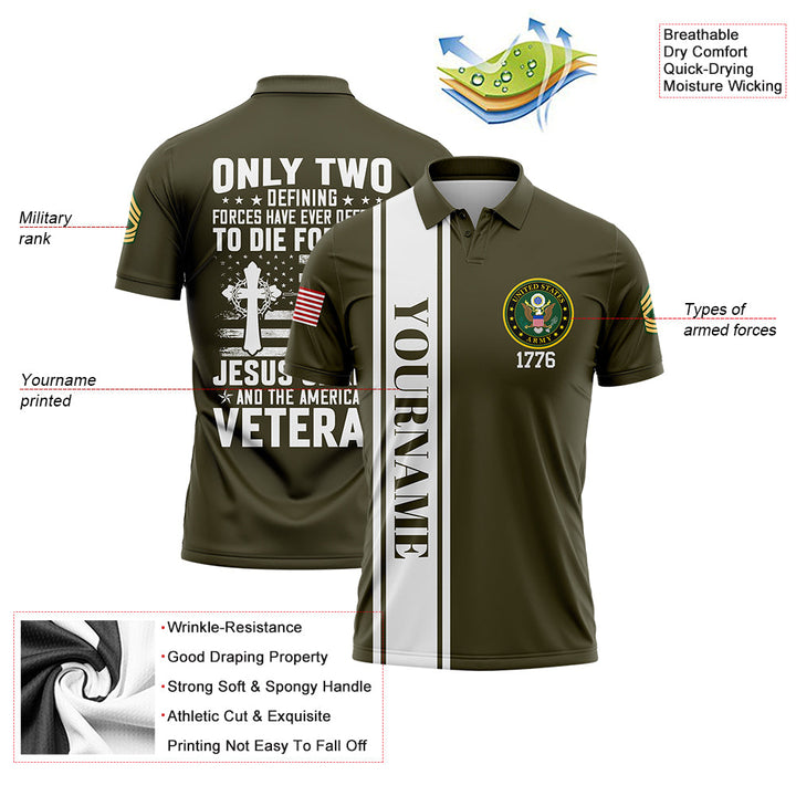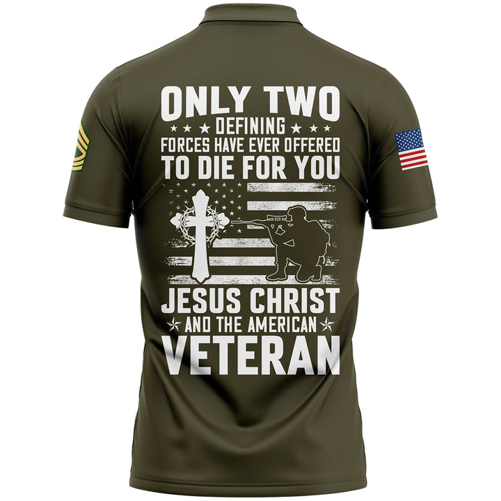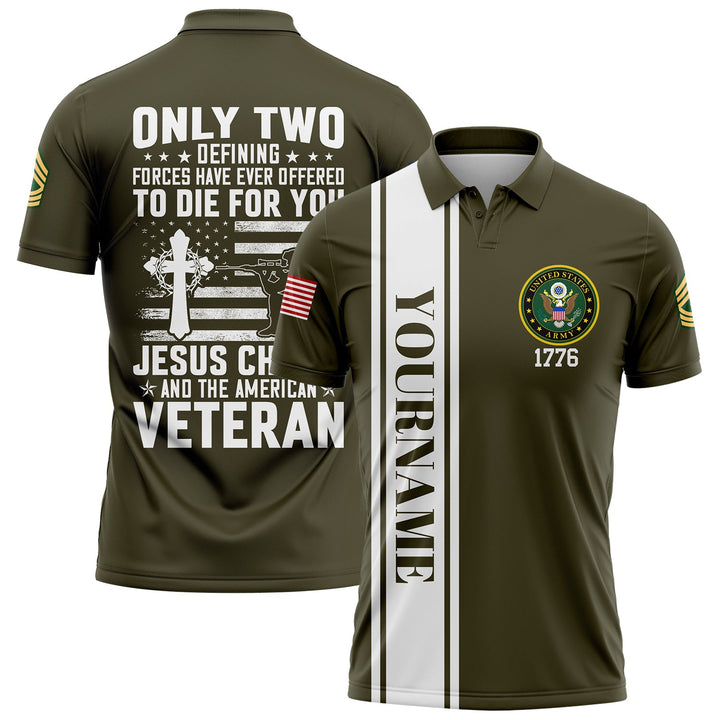 Custom Olive Only Two Defining Forces Have Ever Deffered Jesus Christ And The American Veteran 1776 Flag U.S Army Military Rank Name Veterans Day Golf Polo Shirt | Father's Day Gifts