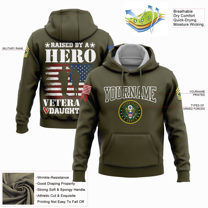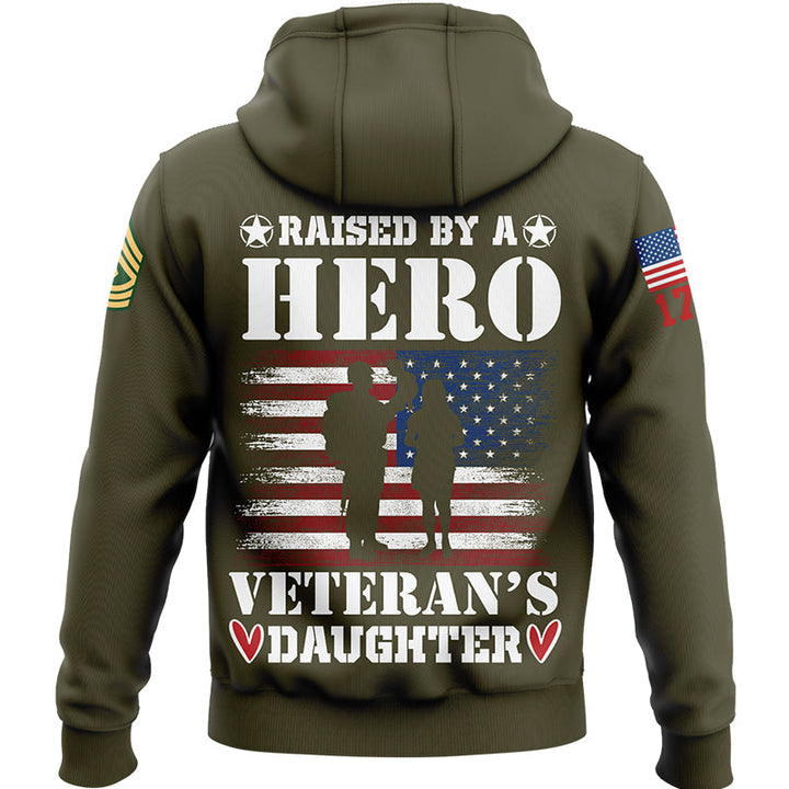 Custom Olive Raised By A Hero Veteran's Daughter 1776 Flag U.S Army Military Rank Name Veterans Day Hoodie | Father's Day Gifts