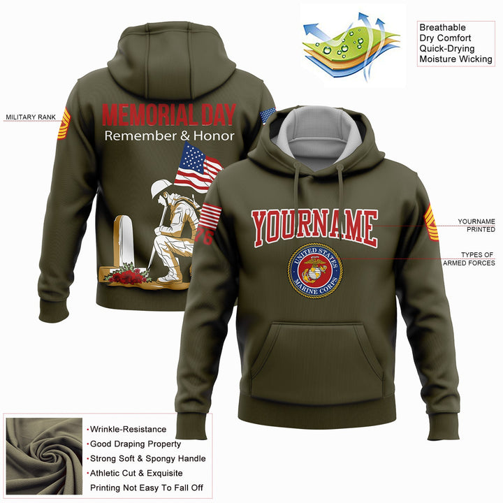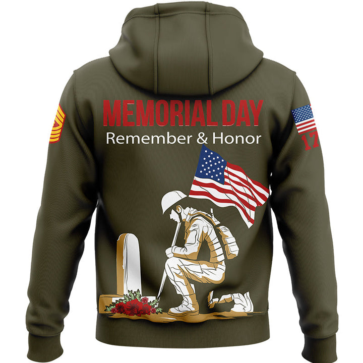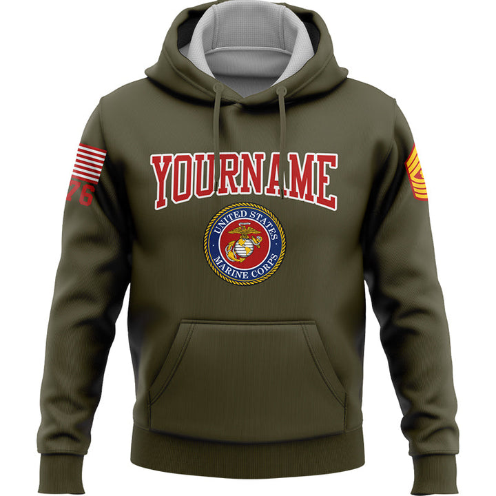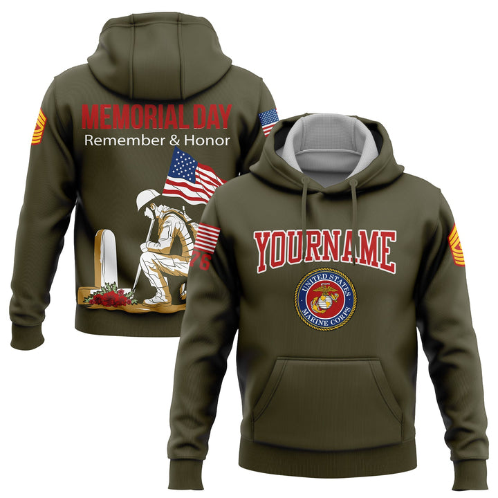 Custom Olive Remember Honor 1776 American Flag U.S Marine Corps Military Rank Name Memorial Day Hoodie