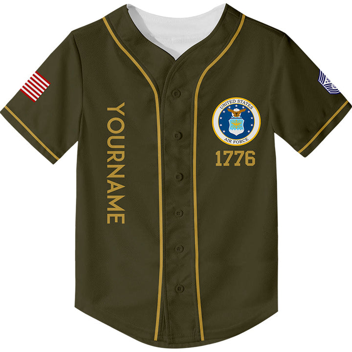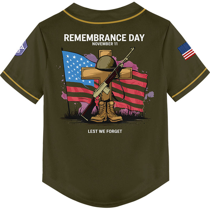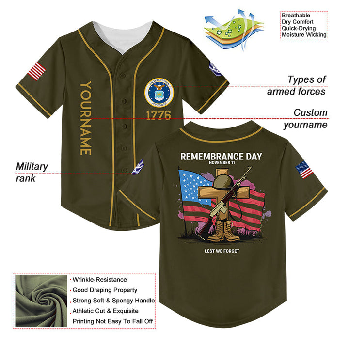 Custom Olive Remembrance Day November 11 Lest We Forget 1776 American Flag U.S Air Force Military Rank Name Memorial Day Baseball Jersey