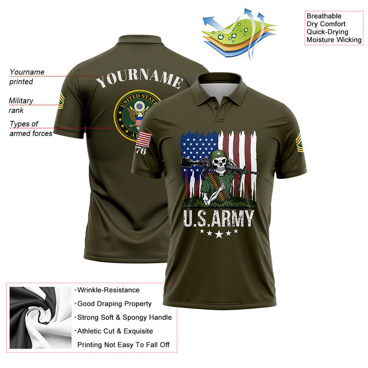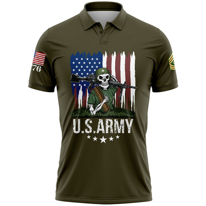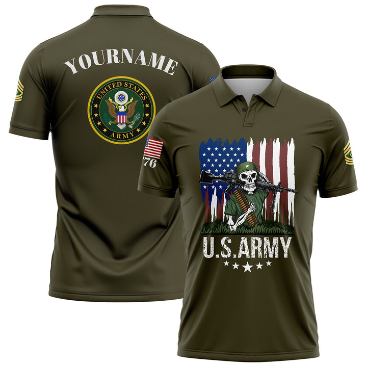 Custom Olive Skull Soldier 1776 American Flag U.S Army Military Rank Name Golf Polo Shirt