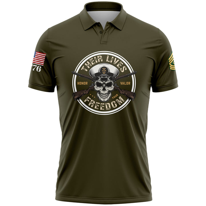 Custom Olive Skull Their Lives Freedom 1776 U.S Army Military Rank Name Golf Polo Shirt