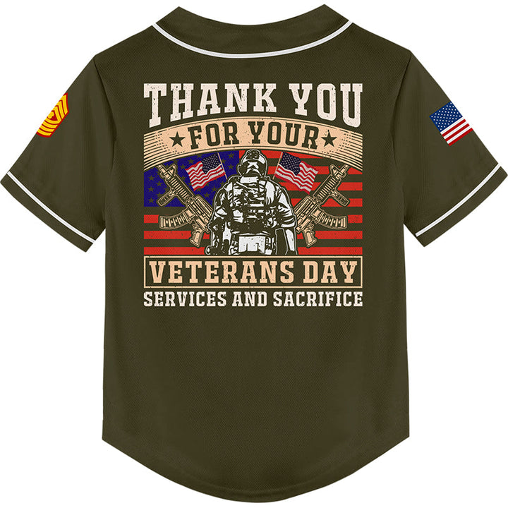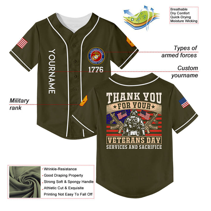 Custom Olive Thank You For Your Services And Sacrifice 1776 American Flag U.S Marine Corps Military Rank Name Veterans Day Baseball Jersey