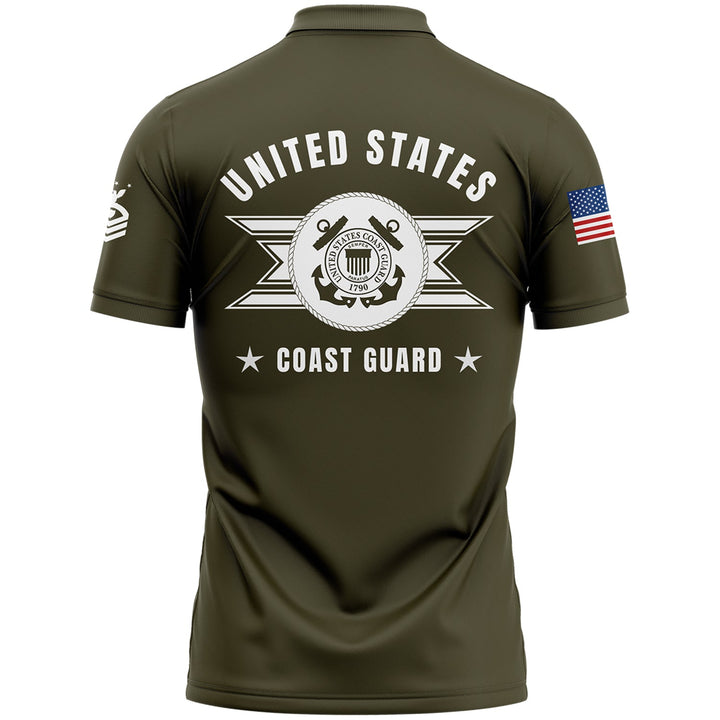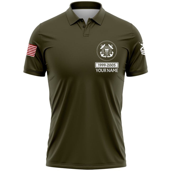 Custom Olive U.S Coast Guard Military Rank Veteran Name Golf Polo Shirt