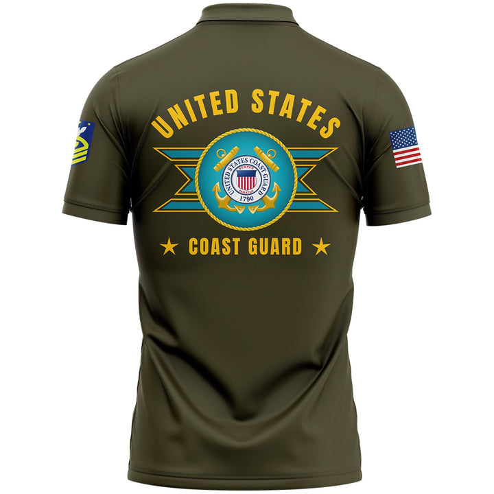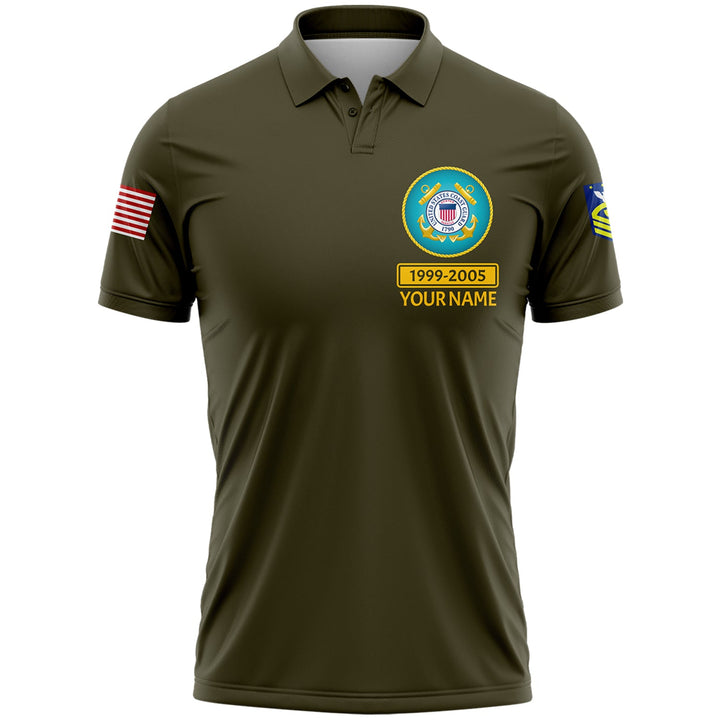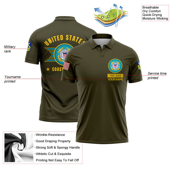 Custom Olive U.S Coast Guard Military Rank Veteran Name Golf Polo Shirt