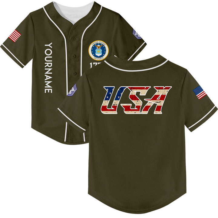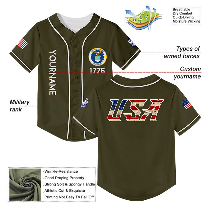 Custom Olive USA 1776 American Flag U.S Air Force Military Rank Name Baseball Jersey