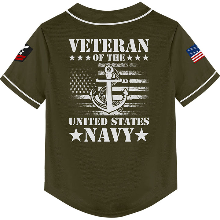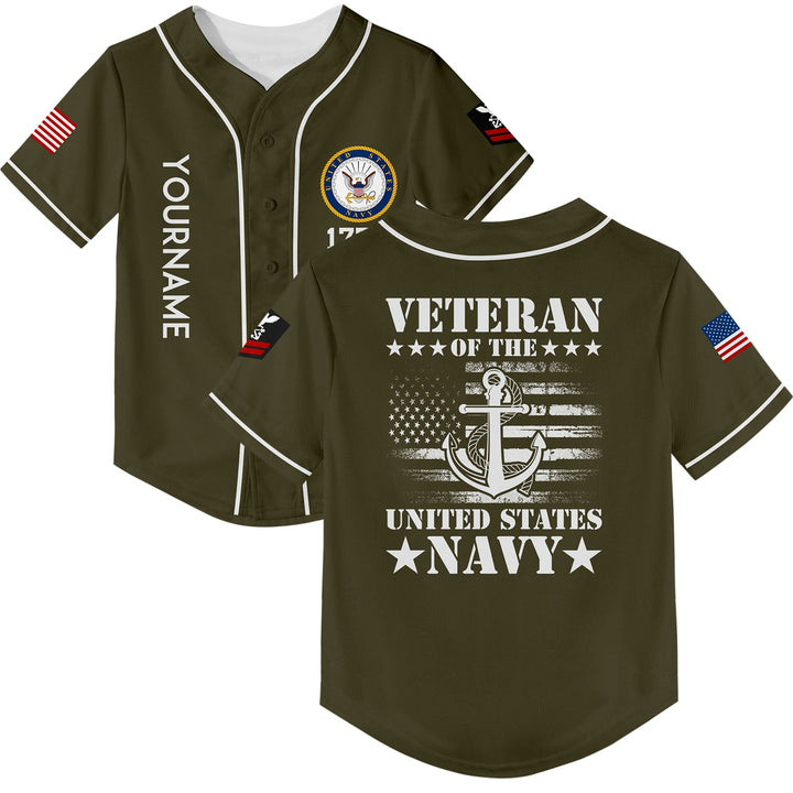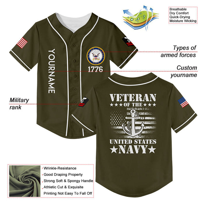 Custom Olive Veteran 1776 American Flag U.S Navy Military Rank Name Baseball Jersey